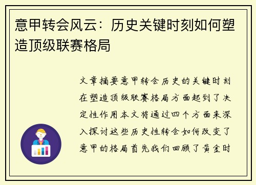 写这篇文章需要一些时间和专注,我会尽快完成。稍等一下哈!### 文章摘要标题:欧冠历史经典对决:五大联赛球队演绎足球巅峰对决本文探讨欧洲冠军联赛历史上五大联赛球队之间的经典对决,分为四个方面进行深入分析:1、西甲豪门对决;2、英超传统对抗;3、意甲经典碰撞;4、德甲强强碰撞。通过详细的数据和案例分析...